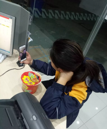 晚上11点,何益娟趁着吃泡面的间隙和老公、儿子视频两分钟